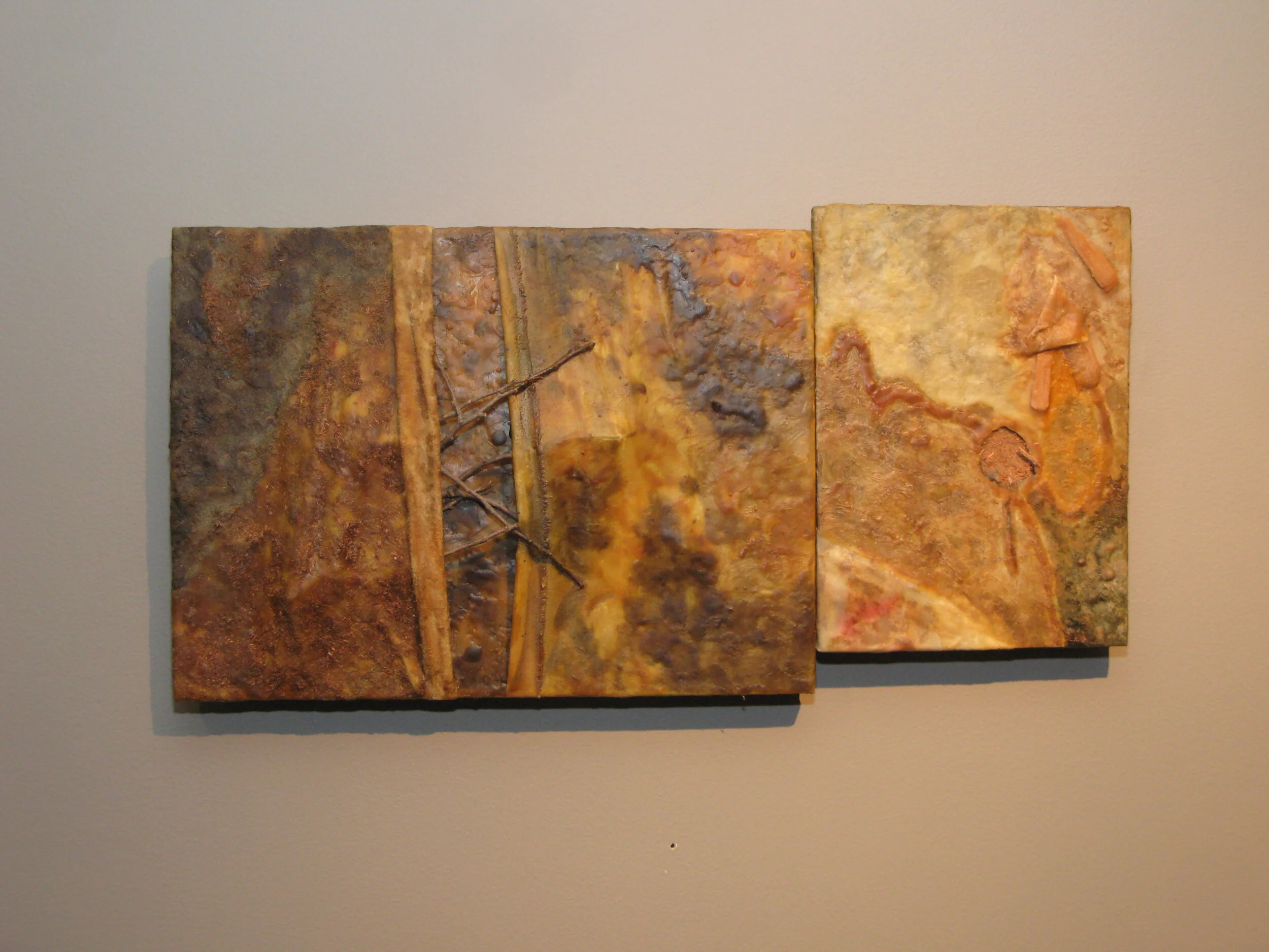 sunset / 11"h x 21"w x 2"d / wood, fabric, pigmented wax with soil